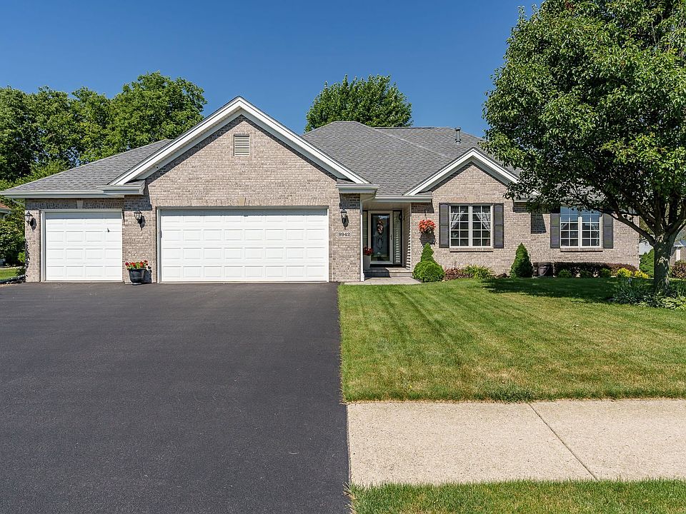 This stunning 3280sq' Ranch boasts a coveted great room floor plan and beautiful curb appeal, with a charming sidewalk leading to the front door. Meticulously maintained, the property features a spectacular yard with perennial gardens. The gourmet kitchen and dining area are equipped with granite countertops, stainless appliances, and a bar counter, perfect for entertaining. Sliding doors lead to the patio, offering seamless indoor-outdoor living. The master bedroom features a walk-in closet and luxurious bathroom with double sink vanity, tub, and shower. Two additional bedrooms and 1.5 bathrooms are situated on the main floor, while the lower level includes a spacious rec room, office, and full bathroom. A 3-car attached garage provides ample storage and convenience, making this exceptional home the perfect blend of style, functionality, and outdoor living. UPDATES INCLUDE: Washer, Dryer, Gas fireplace insert, Stainless steel chimney chase cover all 2017/Master bath storage cabinet, Main bath vanity & top, Master bath vanity & top 2018/Patio & Sitting wall 2019/Front sidewalk 2020/Roof, Gutters, Dowspouts, 50 Gallon Water heater, Fence, Irrigation, Water Softener resin replaced all 2021/Lawn edging & River rock, New Driveway and Basement bathroom 2023. All appliances stay.