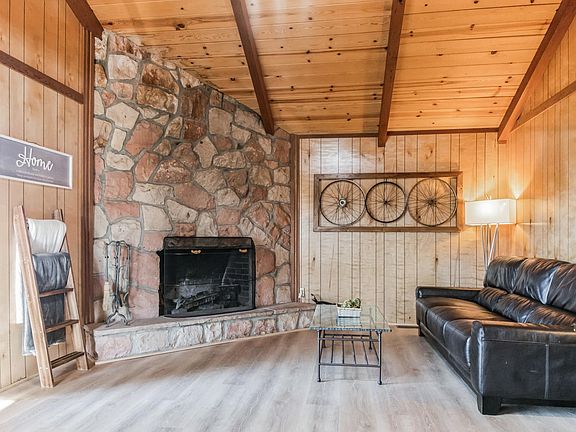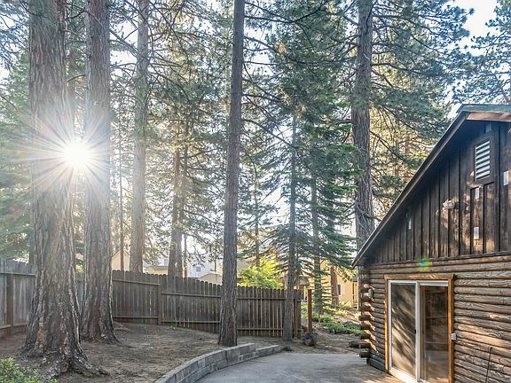 Imagine listening to the soft crackle of wood burning in a stone fireplace, sitting in an open concept living room with high ceilings, exposed beams, and large windows, that bathe the space in natural light and views of the mountains. This charming log cabin has a covered porch and wood siding creating a rustic and cozy appearance. New installments include LVP flooring and ample recessed lighting over the kitchen. Enjoy gaming and concerts at casinos or cool down at Speedboat Beach all within proximity to the home. The lot is backed to Forest Service land with easy access to the Stateline Lookout hiking trail, and the fence in progress will be completed before close of escrow.