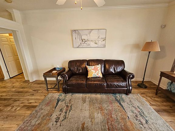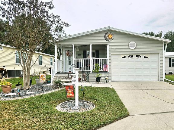 Located in a 55+ leased land resort community, this impressive residence features two bedrooms, two bathrooms, a den, and encompasses just under 1,800 square feet. Situated on a cul-de-sac, the property offers a welcoming front porch, custom curbing, and low-maintenance landscaping. Inside boasts an open layout with durable vinyl plank flooring throughout, complemented by crown molding, solar tubes, double-pane windows, and a remodeled kitchen. The kitchen features metro tile, quartz counters, a central island with pendant lights and seating, stainless steel appliances, and a brick façade above the microwave and range. Adjacent to the kitchen, additional cabinetry with pull-out drawers provides extra storage. The laundry room includes updated appliances and leads directly to the attached one-car garage, which also accommodates a golf cart. The spacious primary bedroom features an accent wall and walk-in closet, while the upgraded ensuite offers a tiled shower with bench, grab bars, dual vanities, a water closet, and space for added storage. The guest bedroom includes two single beds and a shower/tub combination. The den is equipped with a built-in desk and chair, leading to the carpeted 10x26 lanai, which showcases all-glass sliders and views of the wooded surroundings. Additional highlights include a water softener, partial furnishings, and a golf cart included with the home. Buyers do not own the land and must pass a background check, credit check, and meet financial requirements to obtain park approval to reside in this community. Residents pay a monthly lot lease ranging from $1100.00 and up and age restrictions apply. The fees include the use of two pools, two hot tubs, a fitness center, tennis courts, bocce ball courts, pickle ball and horseshoes and access to the clubhouse. The community also has an onsite Bar & Grill which features daily specials and monthly entertainment. Lawn mowing, biweekly trash pickup and a 24-Hour staffed guard gate. The community has two18-hole golf courses where residents may purchase membership or a 'pay as you play' option. All listing information is deemed reliable but not guaranteed and should be independently verified through current rates of lot rent, fees, or pass-on costs associated with the community, park, or home from the community manager. The home is sold as is and in its present condition.