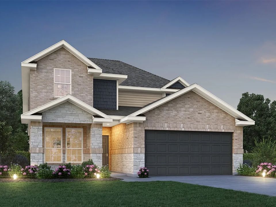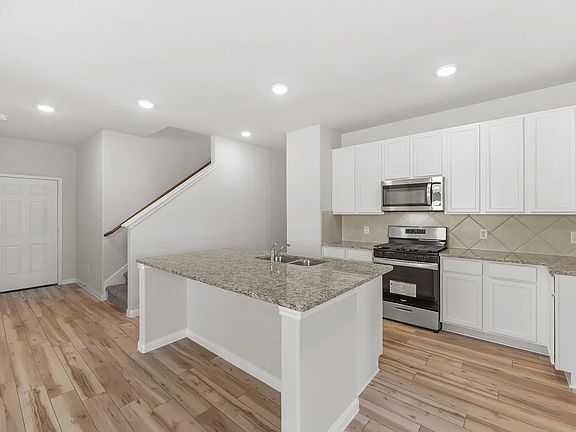 The open-concept layout features vinyl plank flooring, privacy blinds, and a gourmet island kitchen with 42-inch cabinetry, granite countertops, and stainless-steel appliances. The Owner's Suite includes a bay window, spa-like bath with separate tub and shower, and a walk-in closet. Upstairs, flexible bedrooms provide space for family, guests, or a home office.