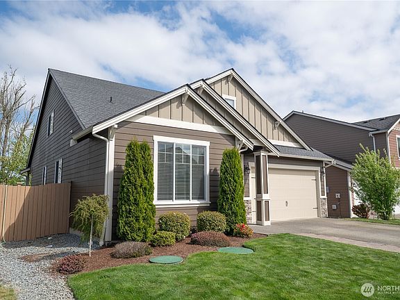 Welcome home! This outstanding residence boasts 4 bedrooms, 3 bathrooms & a bonus room. The primary bedroom features an en-suite 5 piece bath & walk-in closet situated on the main level. The open concept design highlights a kitchen with extensive cabinetry, a large island, granite countertops & stainless steel appliances. The private, fully fenced backyard provides a serene setting w/a view of MT Rainier, complete w/ fruit trees, a covered patio & extended patio space. Greenbelt directly behind for extended privacy. Additional features include a sprinkler system, A/C, custom shelves & custom shades, ceiling fans, vaulted ceilings, tankless water heater & 2 sheds. Neighborhood provides parks & playgrounds. Easy commute to JBLM & Olympia.
