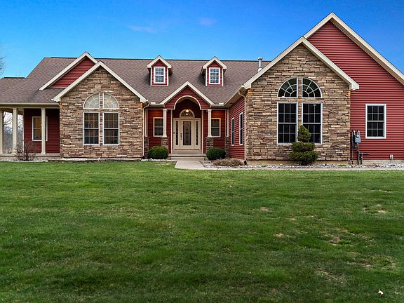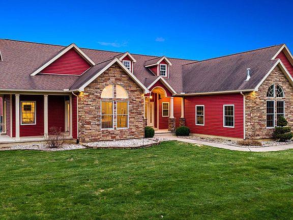 Indulge in unparalleled luxury with this immaculate Custom built home. Situated on 10 acres.. Immerse yourself in the the open floor plan, featuring a spacious GR with FP, DR, and a chef's kitchen adorned with newly painted cabinets Ceiling-to-floor windows adorn both the upper and LL, providing panoramic views and sunsets. .Luxurious master suite with a sitting area, WI closet, and a glass-enclosed shower ,Dual staircases lead to the LL, where you'll find a spacious FR, office and a 4th Bed, Whole-home generator and geo HVAC, a 5000 sq ft barn, newly finished with epoxy floors and is heated, cooled, and has a full bath. Lounge by the newly lined pool, or unwind in the pole barn with electric, creating the perfect setting for outdoor gatherings. This is the epitome of luxury living.