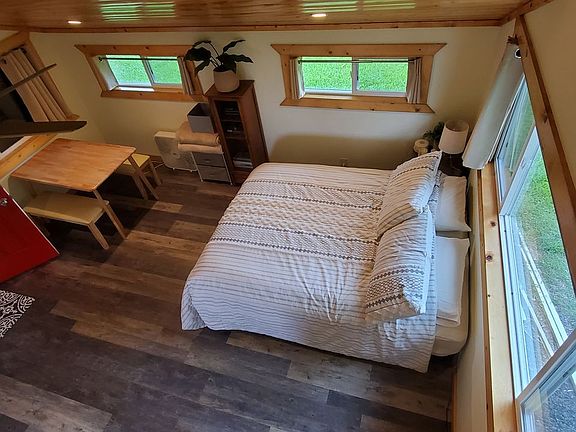 - Fully furnished with queen bed, dining table, and stocked kitchen (stove, fridge, microwave, toaster, coffee maker, dishes, pots, pans, utensils, etc.)