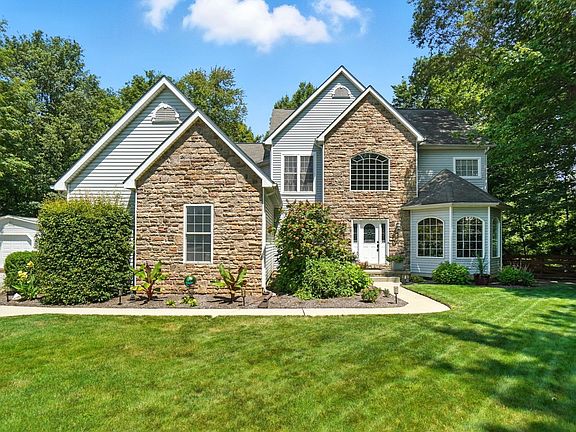 Inside, the grand two-story foyer opens to a spacious living room with a wood-burning fireplace (propane-ready) that flows seamlessly into the gourmet kitchen and eating area. The kitchen impresses with stainless steel appliances, double ovens, abundant cabinetry, and generous counter space. Just off the kitchen, the four-season room provides year-round enjoyment and easy access to one of three 16'x18' decks overlooking the peaceful property. The first floor also includes a formal dining room, private home office, laundry, and a convenient half bath. Upstairs, you'll find three bedrooms and two full baths, including an owner's suite with vaulted ceilings, two walk-in closets, dual vanities, soaking tub, separate shower, and private covered deck. The second-floor landing offers flexible space and could easily be finished into a fourth bedroom. The full 13-block-high basement is plumbed for an additional bath and includes two staircases, providing excellent potential for expansion. Additional highlights include a Bose multi-room audio system with built-in audio cabinet, a new AC unit and heat pump (2024) with a 10-year transferable warranty, Culligan water softener, and two laundry hook-ups (first floor and basement).