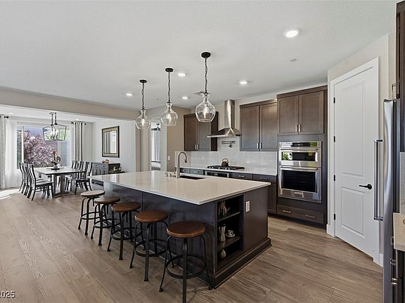 Welcome to 9953 Blackbark Court—an exceptional home in the desirable gated community of Sky Canyon. Situated on an oversized lot, this property offers a true indoor-outdoor lifestyle with a contemporary pool and spa, covered patio, paver driveway and walkways, built-in BBQ, full outdoor kitchen, and mounted outdoor TV—perfect for entertaining. Inside, you’ll find a spacious open floor plan with beautiful luxury vinyl plank flooring, stylish finishes, and extensive upgrades throughout. The gourmet kitchen features top-of-the-line stainless steel appliances, quartz countertops, an oversized island, and a large walk-in pantry. The luxurious primary suite boasts views of the backyard and pool, a large custom walk-in closet, and a spa-inspired bathroom with an expansive walk-in shower. Completing this impressive home is an oversized 3-car tandem garage and thoughtful design elements that blend comfort, elegance, and functionality in one of Las Vegas’s most sought-after communities.