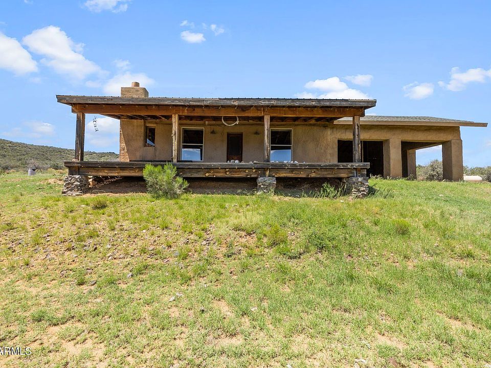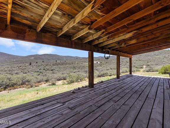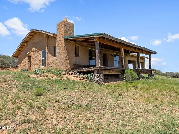 Discover sustainable living with panoramic views in every direction! Nestled on just under 20 acres of patented land, this 1,224 sqft straw bale home with 864 sqft garage offers an eco-conscious lifestyle with modern comfort and unique off-grid potential. Built with 48'' x 12'' x 16'' thick straw bale walls then covered with concrete, this home provides incredible insulation, keeping it cool in summer and warm in winter — often needing no additional heating or cooling. When needed, enjoy a cozy wood burning fireplace and energy-efficient ceiling fans powered by a generator or install a solar system that is already wired for inverter and panels. Basic kitchen with propane stove gravity-fed hauled water, copper countertops. Additional features Pre-wired for solar - just add panels, inverter, and marine batteries or generator backup, Efficient tankless water heater, Compost toilet ( no septic installed ), Modern shower setup, and includes patented mining claim. This self-sufficient home is ideal for off-grid living or a retreat from the ordinary. The solar system will need to be installed for financing, but the infrastructure is ready just plug and play. Whether you're a homesteader, minimalist, or investor, this rare property blends sustainability, privacy, and freedom in one of Arizona's most beautiful high desert landscapes.