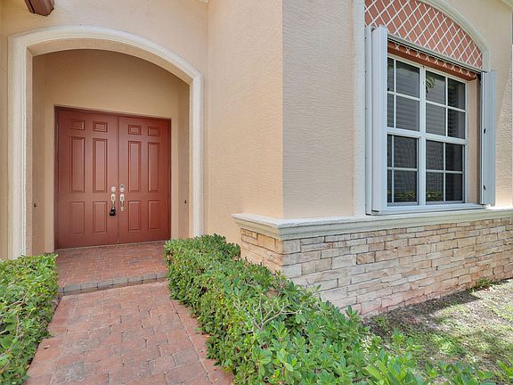 ONE OF THE NEWER ISOLA BELLA ESTATES HOME BUILT IN 2012!! Meticulously maintained 4 br estate home with serene lake front view. You can feel the pride of ownership as you walk thru the double door entry. Custom crown and trim throughout. Spacious primary bedroom with 2 walk in closets, a private ensuite guest room & two oversized secondary bedrooms, one with a private courtyard! NEW AC & HWH replaced in 2024. Refrigerator, microwave & dishwasher replaced in 2023. Laminate wood flooring in all BRs. accordion shutters.Extra long driveway. Double door entry with keyless entry system  Wall mounted TV in living room stays for buyers enjoyment! Nest thermostat. Excellent schools! Original owners have taken impeccable care of this home....AND room for a small pool in the back yard too!