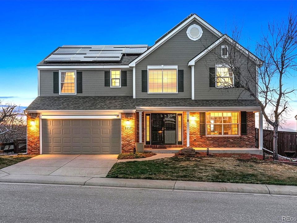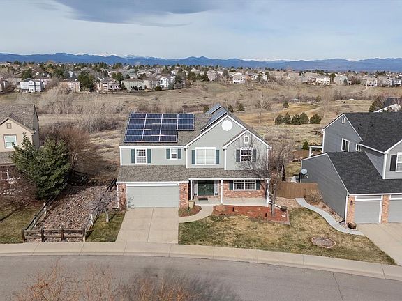 Impeccable Turnkey Home on Prime Lot Backing to Open Space! Stunning Mountain Views from all 3 levels! Welcome to this 6 Bed PLUS Office, 4 Bath home w/finished walk-out basement in desired Heather Hill community. Nearly 4300 Total Sqft. NEW: Main Floor Carpet, Radon System, Extended Deck w/Privacy Wall, Interior Paint. NEWER: Water Heater (2024), Hail-Resistant Roof (2023), Refinished Hardwoods & Exterior Paint (2022). Well-designed floorplan features sizeable family room w/vaulted ceiling & gas fireplace (amazing views!); opens to kitchen & breakfast nook. Convenient Main Floor Bed #5/office sits next to updated 3/4 bath (new LVP floor & shower enclosure). Enjoy meal prep in the updated & functional gourmet kitchen, boasting white cabinets & large island, quartz counters/beveled subway tile, new sink/faucet & pantry. Stainless steel appliances include cooktop & dual ovens (2022), fridge, microwave & dishwasher. Formal dining & living rooms offer more living space. Enjoy the open space/mtn views from the new, low-maintenance deck w/table & 6 chairs! Private yard has lower covered patio & garden beds. Upstairs find 4 roomy bedrooms & handy laundry room w/shelves, counter, new flooring (W&D stay). Find serenity in the Primary Suite featuring vaulted ceiling (views!) & dual walk-in closets. En-Suite 5-pc bath has updated vanity & new shower enclosure. 3 more beds near updated 4-pc hall bath. More living space in basement: spacious rec/living room (views!) w/wet bar (sink, cabinets, mini fridge, wine rack), Bed # 6, 3/4 bath, bonus room/office (no closet) & huge storage room w/built-in shelves. Upgraded light fixtures & ceiling fans in most rooms, rod iron railing & vaulted entryway. Bonus: Attic fan, upgraded insulation, solar panels. Feeds to top-rated Heritage Elem, Mtn Vista HS; walk to Valor HS. Steps to Dad Clark Park, community garden, dog park, miles of trails! Low quarterly HOA gets 4 rec centers, pools, tennis, fitness. Includes 14-mo Buyer’s warranty.