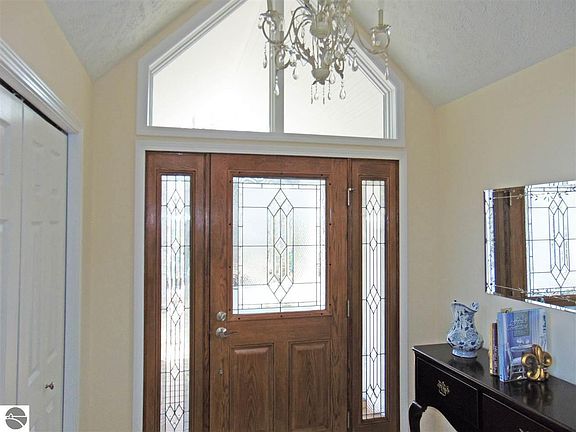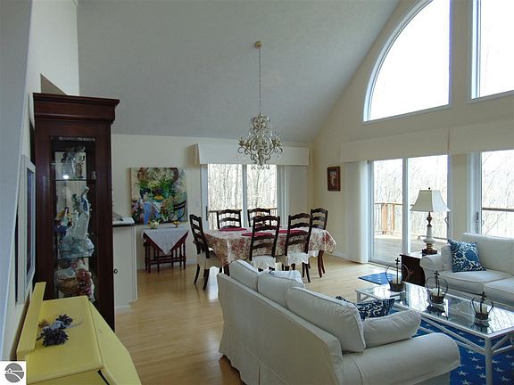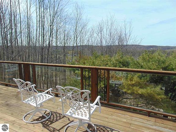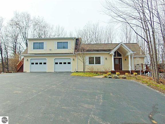 This is a wonderful home, almost tree house like, perched on a hillside and nestled into the Lime Lake Valley with lots and lots of great features. A paved driveway leads to this spacious family abode, grand foyer entry with beveled glass door and side flanking light windows, hard maple flooring in the open floor plan living, dining, and beautiful kitchen with granite counter tops and lots of work surfaces & storage, elevated counter for the chef's supervisor and conversation. Gas fireplace, vaulted ceiling, large wrap around deck, views to the north with a glimpse of Lime Lake and Good Harbor Bay, and rolling Leelanau County Hills, roomy main level master suite with generous closet, double vanity, and walk in shower, sun-washed studio space with sturdy tile flooring and abundant craft storage, heated and finished 2 car garage with water and work bench area (and that's just the first floor!) Upper level loft bedroom with private bath and home office/sitting area with water views, lower walk out level with terrace/patio garden views, additional bedroom, bath, and extra room for library, storage, currently used as an exercise room. Nearly 600 sq. ft. apartment above garage with it's own entry, kitchen, and full bath, great for family members needing their own space while visiting or consider an AirB&B or VRBO space? Great 30x60 heated shop space (built in 2006) with steel on the walls and ceiling, 11' H x 10' W overhead door (RV storage needs?), 9000# capacity lift, and full length attic storage. Very well maintained & nicely landscaped with outdoor living areas, a walking path that meanders thru this rolling and wooded site, close to multiple points of public water access on Lime, Little Traverse, or Lake Michigan, two golf courses, and lots of recreational opportunities. A wonderful place to call home!