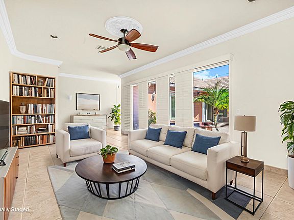 Tucked away yet close to every convenience, this exceptional courtyard villa offers one of the most spacious layouts you'll find all on one floor complete with a fabulous upgrades throughout.As you step inside, you'll immediately appreciate the generous living room space enhanced by plantation shutters and crown molding. The beautifully updated kitchen features granite countertops and matching backsplash, stainless steel appliances, and a center island, all seamlessly connected to a charming breakfast area. The living room, family room, kitchen, and primary suite all overlook your private courtyard which is a serene space perfect for relaxing, entertaining, and outdoor dining. Inside, this super spacious flexible floor plan offers many possibilities. The family room can easily transform into a formal dining area, home office, or media space. One bedroom is located at the front of the home, while the primary suite and third bedroom sit toward the back for added privacy. The large primary bedroom features an impressive walk-in closet, while the ensuite bath includes a Roman tub, separate shower, and dual sinks. Though classified as a villa, this residence feels like a single-family home thanks to its thoughtful architectural details, beautiful flooring, granite finishes, crown molding, plantation-style window treatments, accordion hurricane shutters, and abundant space. This is a must-see property prepare to be impressed! And there more!!!! The hot-tub/spa in the courtyard is included!!