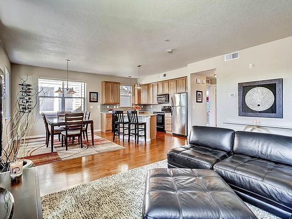 The living is easy in this stylishly contemporary residence. Loads of upgrades: Slab Granite Counter Tops in Kitchen * Professionally Tiled Kitchen Backsplash * Wood Floors * Slab Granite Counters in both Bathrooms * Wired for Surround Sound in Living, Designer "Up/Down" Blinds/shades in every window, over looks new 25 acre park! Shows like a model home. Cool and calm with sophistication, this home is enveloped in light and comfort. Creamy nutmeg walls, cherry stained wood floors and upgraded accents throughout create a style both timeless and functional. The sleek and open kitchen inspires your culinary creativity with imported granite countertops, professional tiled backsplash, premium stainless steel refrigerator, and quality wood floors. Play in your own backyard with fine dining, shops, gourmet supermarkets (Stanley Market Place is only 2 blks walk away!), bike/walking trails, pools and a new rec center at your doorstep, or hop the light rail to Downtown and DIA with ease.