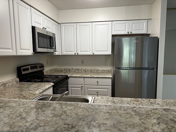The kitchen boasts brand new appliances, including a sleek refrigerator, microwave, and stove, all complemented by ample cabinet space and elegant countertops.