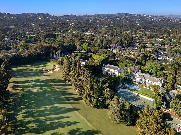 Set beside the exclusive LA Country Club, this expansive 1-acre gated estate has been meticulously remodeled to blend old-world glamour with modern elegance. Set back behind a grand, gated motor court, the property ensures unparalleled security and privacy. A grand two-story foyer with warm tones, natural light, and graceful curved lines creates an inviting and sophisticated atmosphere. To the right, a formal living room with a fireplace sets the stage for elegant entertaining, while an office with a bar and coffered ceiling adds timeless charm. Multiple gathering spaces, including a dining room overlooking the manicured grounds, flow seamlessly throughout. The opposite wing features a gourmet kitchen with dual islands and top-of-the-line appliances, a breakfast nook, and a cozy family room that opens to an outdoor dining area shaded by mature grapevines. Upstairs, the expansive primary suite features a fireplace, dual walk-in closets and bathrooms, and a private balcony overlooking the backyard and golf course. Five additional bedroom suites offer ample space for family and guests. Outside, a private oasis awaits. Lush landscaping surrounds a large patio for dining al fresco, firepit, flat grassy lawn, resort-like pool with spa, pool house with additional patio space, tennis court with lights, and an additional deck area that overlooks the impeccably landscaped fifth fairway. Offering a seamless blend of luxurious living and resort-style amenities, this estate provides an unparalleled opportunity to experience the epitome of refined elegance in one of Los Angeles' most coveted locations.