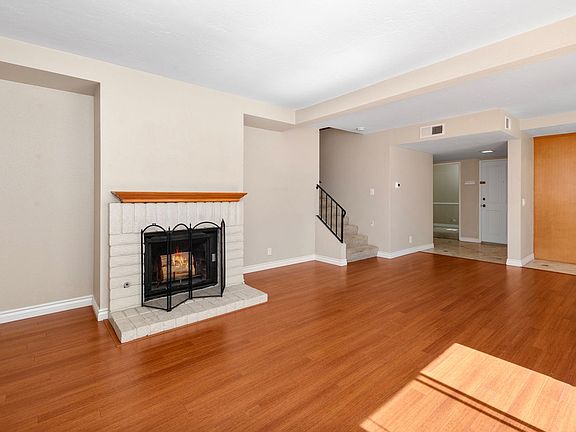 Wood Laminate flooring on main level, fireplace, small south exposure patio, stainless steel kitchen & granite countertops, neutral interior paint, central air and heat, full 2 car garage attached to the unit with lots of extra storage. Upstairs master bedroom has a walk-out balcony with pool & jacuzzi area view. Second floor also has full size laundry closet room.