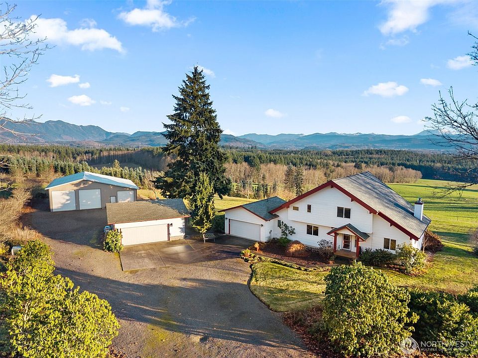 Wake up to breathtaking panoramic mountain views in this 3-bedroom, 2.5-bath home filled with natural light. Tongue-and-groove vaulted ceilings and cathedral windows create an open feel, while the living room offers a cozy wood fireplace insert. Enjoy the views from the expansive deck, ideal for relaxing or entertaining. The home and outbuildings have been recently reroofed and upgraded with LED lighting. A heat pump A/C system provides efficient comfort. The primary suite features a heated soaking tub and separate shower. Property includes an attached 2-car garage, a fully insulated 48x48 shop, and a separate insulated detached shop/garage with loft, workspace, wood stove, 220 power, and full bath. The home is wired for a generator and includes fruit trees and garden space. A must-see property with stunning views, function, and flexibility.
