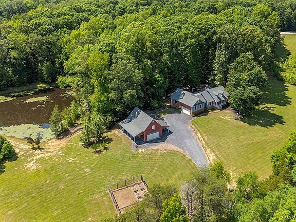 is Situated on nearly 7 Secluded Acres; Overlooking a Generously Stocked Pond, Teaming with Wildlife; Including Bass and Crappy. Built in 2015, this Home Features 9 Ft Ceilings, Recessed lighting, Wood Paneling Accents that Create a Custom Feel to the Space. The Primary Bedroom has a Tray Ceiling, Large Master Bath with Garden Tub, Separate Shower, His and Her Closets and Sinks. Don’t Forget the Doggie Door! The Kitchen, with Stainless Steel Appliances, Recessed Lighting, Granite Countertops, a Deep Stone Sink, Soft-close Wood Cabinetry and Breakfast Bar, Opens onto the Dining Room and Living Room; with a Beautiful Custom-Built Stone Wall, and a Wood-burning Stove that Heats the Entire House.