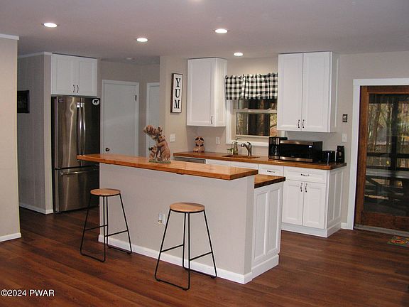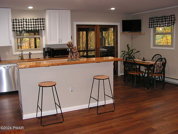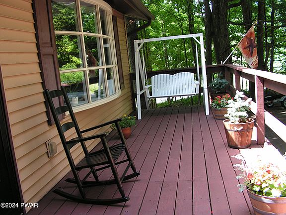Quick settlement possible means you could be enjoying your own 4 BR/2 1/2 BA home in one of the Pocono Region's finest amenity filled communities for the holidays. Nestled in a quiet area of The Hideout with vacant wooded lots on each side, this easily accessible ranch home features open layout living room/kitchen/dining area with brick fireplace and sliding door access to large screen porch with gas grill and picnic table. Spacious lower level features den with wood stove and exterior access; laundry/workshop area with washer/dryer hookups and bedroom currently being used as a gym with fitness cycle, professional gym quality bench and barbell set, and antique jukebox/records conveying with accepted offer.Exterior features an area beside the paved driveway for boat/trailer parking; rear shed for tool/fishing/boating equipment storage; and spacious front deck with storage area below. Vinyl siding, tilt windows and no carpeting makes for easy cleaning and maintenance.The Hideout features gated community access; swimming pool; ski/snow tubing area; golf course; fitness center as well as year round activities for children and adults. Less than ten minutes away are local farm markets; grocery/hardware/dollar stores; pharmacies; restaurants and taverns; veterinarian; local banks; auto service and wildlife park.Family of local author and wildlife photographer is relocating which means a negotiable price and best offer could have you moved in before the holidays.