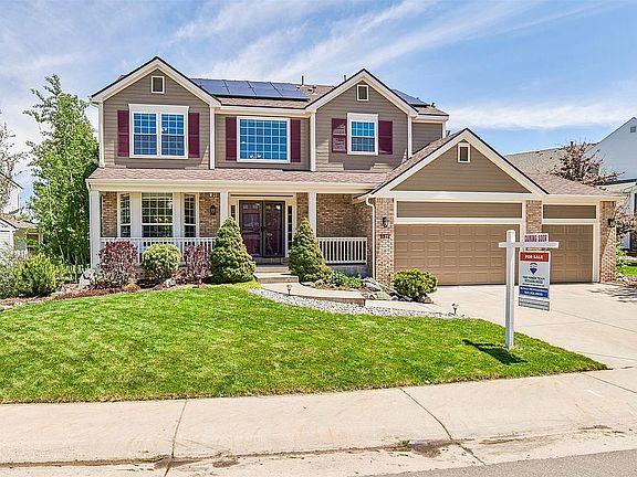 This is a rare opportunity to live in Heather Hill/Highlands Ranch! Excellent Updated & Move-In Ready home: 5 beds, 4 baths with finished basement, 3 car garage sitting on an expansive 0.18 acre lot. Highly maintained by original owner! Newer HVAC & humidifier (2018), water heater (2015), Class 4 impact-resistant roof (2014), owned solar panels (2019) & many windows upgraded. Brand New exterior paint and custom bi-directional blinds! Upgraded light fixtures, wrought-iron railings, 9 ceilings on main level. Flowing floorplan features formal living & dining rooms, kitchen open to family room. Hardwoods extending from dining room to kitchen. Updated kitchen has freshly painted 42 cabinets, granite, SS appliances (new double-oven range!), island & breakfast nook. Spacious family room with corner fireplace & access to backyard. Park-like yard with extended patio, many trees for privacy. Newly updated powder room. Mud room with new flooring, shelving & closet (can be converted to laundry room). Upstairs features a Master Suite with attached 5-pc bath with new floors, His & Hers closets! 3 more spacious secondary bedrooms with ceiling fans plus a centrally located full bath. Finished garden level basement offers more living space- large rec room, bedroom #5/office & updated 3/4 bath plus storage room. The laundry closet has included W&D, storage cabinets & room for folding table. Tons of storage in dry-walled, 3 car garage. Gorgeous curb appeal with mature landscaping & covered front porch. Owned solar panels: buyer takes over payments or seller will pay off with right offer! Walk to top-rated Heritage Elem, Valor HS, Dad Clark Park. Low HOA gets 4 rec centers, pools, tennis, fitness. Miles of trails! Near Town Center, Central Park, new hospital. Easy to C470, LightRail. Must See!