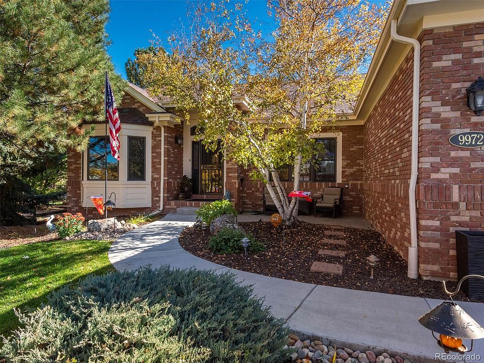 An exceptional ranch home nestled on a cul-de-sac lot with mature landscaping in the heart of Highlands Ranch. True main floor living meeting all of your expectations! Step in from the front patio into the welcoming entryway with hardwood flooring leading to the kitchen which opens up to the impressive great room all filled with natural light! You will love the open concept kitchen with beautiful cabinets, quartz countertops, stainless steel appliances include KitchenAid refrigerator, dishwasher, double ovens, & a Jennair gas cooktop plus the vintage style center island. The kitchen is conveniently between the dining room in the front and on the other side you have the eating nook overlooking the spacious yard with beautiful trees, large deck, garden areas and a charming shed. You’ll surely enjoy the outdoor living all year round! This home features a main floor primary bedroom suite with sitting room and the 5 piece primary bathroom w/a large curbless shower, a jetted tub & an ample walk in closet!  To complete the main floor you also have the home office looking out to the front, the  second bedroom, another full bath plus a laundry room with a utility sink. You will love having a finished basement that offers plenty of versatile rec space, two additional bedrooms, a ¾ bathroom plus the storage space every house should have! You won’t be disappointed-it’s a rare find!