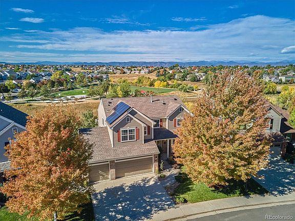 WOW! This checks all the boxes! Impressive mountain & open space views from all 3 levels of this 5 bed, 4 bath, finished walk-out basement home in popular Heather Hill. Largest model in neighborhood (over 4100 total SqFt). Newer roof, windows, water heater, exterior/interior paint, furnace, water purifier/softener. Hardwoods thruout most of main floor. Flowing floor plan features formal living & dining rooms, family room open to kitchen & main floor bedroom (or office) near 3/4 bath. Spacious gourmet kitchen has 42in cabinets, GE Profile SS appliances (double ovens, cooktop plus NEW refrigerator), espresso machine w/built-in water line, island & breakfast nook. Gas fireplace & built-in speakers in family room plus access to new, partially covered back deck with dual fans & gorgeous views! Main floor laundry/mud room (W&D included). Upstairs find 4 spacious bedrooms: Master Retreat boasts sitting area, His & Hers closets, attached 5-pc bath. Bedroom 2 has walk-in closet, access to 4-pc hall bath. Fabulous finished walk-out basement offers more living space! Features media room with tray lighting, gas fireplace; wet bar w/full-sized fridge & wine cooler, sink & many cabinets plus a fitness room w/ included TV, 3/4 bath, bonus room & large storage room w/shelving & freezer! Walk out to the extended stamped concrete patio to enjoy the pristine yard with garden boxes w/drip lines, storage shed. Oversized 3 car garage has lofted storage, work bench, shelves & utility sink. Owned solar panels for lower utility bills. Walk to Dad Clark Park, top-rated schools Heritage Elem, Mountain Vista HS and Valor Christian HS. Low HOA gets 4 rec centers, pools, tennis, fitness. Miles of trails,! Easy to C470, Light Rail. This wont last!