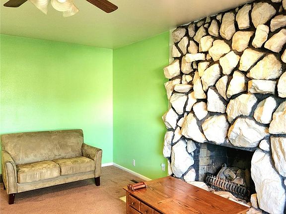 - Description: Spacious Living Space With Recessed Lighting, Ceiling Fan, And Large Stone Fireplace.
