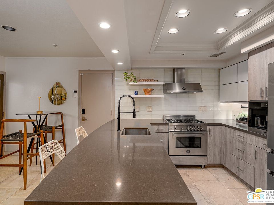 Rarely available single-level living in Village Racquet Club offered in this fully remodeled corner unit with side-by-side two car garage. This bungalow-style condo offers the perfect blend of luxury, privacy, and convenience with 2 bedrooms, 2 bathrooms, and an oversized den that can function simultaneously as an office and third bedroom. Village Racquet Club itself offers unparalleled resort-style amenities including 8 pools & spas, tennis courts, pickleball, racquetball, a clubhouse, and a fitness center -all within a short walk to the vibrant heart of downtown Palm Springs. With only one shared wall, and no unit above it feels more like a private home rather than a condo. Tastefully remodeled from top to bottom, this home exudes elegance with high-end finishes and top-of-the-line appliances. The spacious living room is a showstopper, boasting vaulted 14-foot ceilings, clerestory windows, a contemporary fireplace, and tranquil garden atrium that floods the spaces throughout the home with soft natural light. Floor-to-ceiling windows in the dining area offer stunning views of one of the community's corner pools both day and night. The large primary suite features windows to greenspace, a beautifully renovated ensuite bath, and ample storage in a built-out walk-in closet. The generous second bedroom and additional oversized den provide flexible living options. Thoughtful upgrades include newer double-pane sliding doors throughout, a newer HVAC system, and an AC mini-split in the 2-car garage for added comfort. This home can be sold fully furnished, making it an effortless move-in or investment opportunity.