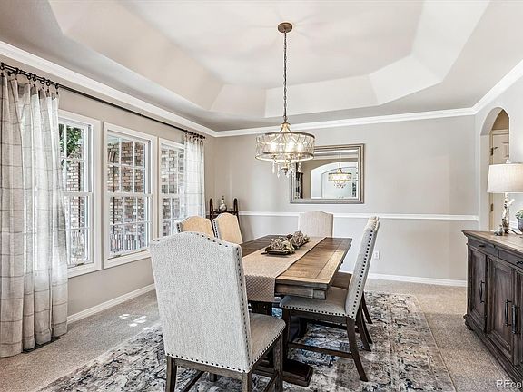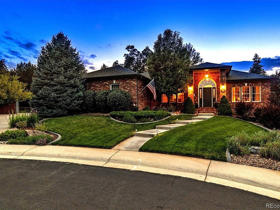 Elevated living in this *rare* Ranch/1-Story Executive home in coveted neighborhood! Sits on prime, nearly *half acre* lot at end of cul-de-sac! This 4672 sqft, 4 bed/4 bath/finished basement oasis is highly maintained & turnkey. Popular floorplan w/high ceilings, refinished hardwoods & newer carpet on main level. Formal dining room w/tray ceiling & crown/chair molding sits across from formal living room *can use as main floor office/den*. Spacious family room w/vaulted ceiling, corner fireplace w/custom stone surround & media nook (TV stays). Updated kitchen features: Bosch SS appliances, ample white cabinets w/crown molding/under cab lighting, granite counters/tile backsplash plus pantry, desk & breakfast nook. Relish the *spectacular*, ultra-private back yard boasting expanded stamped concrete patio w/pergola, infrared heater & custom hi-end retractable awning plus built-in gas grill, smoker & ice chest. Notice the low-maintenance deck w/firepit & French doors to Primary bedroom! Pro putting green, many mature trees, waterfall feature, vast grass area & storage shed complete this uniquely impressive yard. Tranquil Primary Suite has updated 5-pc bath (new tile floor, granite, jetted tub, spacious shower) & large walk-in closet. Second main floor bedroom w/updated private bath, useful hall 1/2 bath & mud room w/sink & closet complete the main level. More living space in finished basement: bonus room w/built-in speakers (TV stays) & eating area, game room (pool table nego) & wet bar (sink, dishwasher, microwave, cabinets), 2 more bedrooms w/walk-in closets near 4-pc bath, huge laundry room w/cabinets & closet plus large storage room. More updates: hail resistant roof, HVAC, H2O heater, interior paint, light fixtures. Oversized garage has new door/side opener, heater/cooling unit, 220V Level 2 charger, cabinets & workbench. Striking curb appeal! Low HOA gets 4 rec centers, pools, tennis, fitness. Miles of trails! Top schools, close to Valor HS. EZ to C470. Must See!