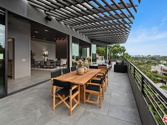 Enjoy expansive views in this modern and innovative architectural masterwork. On a hill in lower Benedict on 20,000 square feet of land, accessed by a 200-foot driveway, this home offers true privacy and tranquility, a refuge from the city. Enter the spacious kitchen where culinary possibilities are unlimited; equipped with commercial refrigeration, restaurant ventilation, and a chef's Garland range. Three dishwashers, built-in Miele coffee machine, and custom cabinetry finished with natural stone slab countertops. The meticulously engineered, all-steel structure with reinforced concrete decks at all levels far exceeds the safety and quality of typical wood framed structures.A convenient commercial elevator stops at 4 levels, including the beautiful roof terrace with a BBQ area and stainless-steel wet bar. Four bedrooms feature fully tiled ensuite bathrooms; the primary bedroom has 2-bathroom/wardrobe suites finished in Walnut Cabinetry, glass mosaic and natural stone patterns. Extensive walnut millwork, illuminated by indirect lighting, creates a warm and subtle lighting effect throughout all rooms of the house.The 600 bottle lighted glass wine room accommodates entertaining, accompanying the culinary capabilities of the house.White oak plank flooring warms the bedroom levels and pool adjacent bar/media area. The main level interior and adjacent terrace floors are elegant large format stone porcelain. Tall ceilings and expansive glass doors flood the interiors with natural light. From its promontory, the views over lower Benedict Cyn., Santa Monica and reflective ocean beyond are irresistible.The unique 25 yard long infinity edged pool and 12 person spa is fully tiled in a subtle stone finish, adjacent lounge seating and 3 bedrooms open onto the pool terrace.Lush landscaped grounds feature dozens of specimen oaks. A towering two-story, six-car garage includes car lifts and double-height glass garage doors; a fully conditioned state-of-the-art space.This unique Beverly Hills residence is a crafted contemporary design, a luxurious statement and a special home.