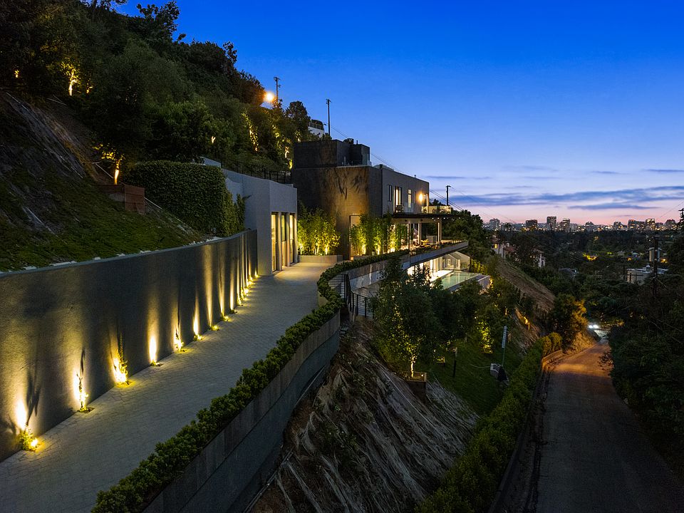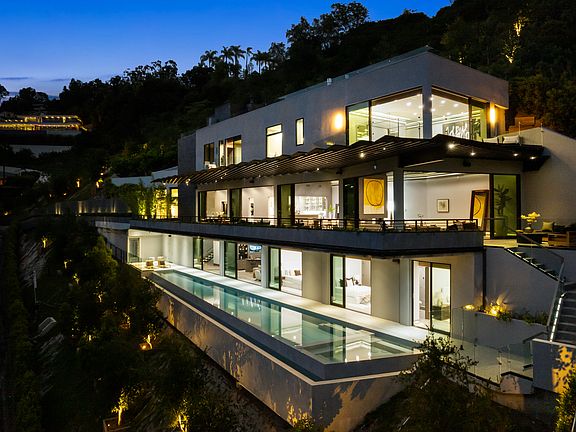 Modern architectural masterpiece Lease/Sale offering expansive views from its hillside location in lower Benedict. Spanning 20,000 square feet, the property is accessed via a 200-foot driveway, ensuring true privacy and tranquility. The meticulously engineered all-steel structure, with reinforced concrete decks at all levels, surpasses the safety and quality of typical wood-framed homes. Inside, tall ceilings and expansive glass doors flood the interiors with natural light, highlighting the elegant large-format stone porcelain floors and extensive walnut millwork.The spacious kitchen is a culinary haven equipped with commercial refrigeration, restaurant-grade ventilation, a chef's Garland range, three dishwashers, a built-in Miele coffee machine, and custom cabinetry finished with natural stone slab countertops. The home's four bedrooms each feature fully tiled ensuite bathrooms, with the primary bedroom offering two bathroom/wardrobe suites finished in walnut cabinetry, glass mosaics, and natural stone patterns. The 600-bottle lighted glass wine room enhances the home's entertaining capabilities, complementing its culinary features. A convenient commercial elevator serves all four levels, including the beautiful roof terrace with a BBQ area and stainless-steel wet bar.Outside, the property boasts a unique 25-yard-long infinity-edged pool and a 12-person spa, fully tiled in a subtle stone finish, with adjacent lounge seating. Three bedrooms open onto the pool terrace, and the lush landscaped grounds feature dozens of specimen oaks. A towering two-story, six-car garage with car lifts and double-height glass garage doors provides a fully conditioned state-of-the-art space. This unique Beverly Hills residence is a luxurious statement and a special home, offering an unparalleled blend of contemporary design and serene living. Tenant pays utilities. Property can be fully furnished and set up for seasonal leases at a higher premium.