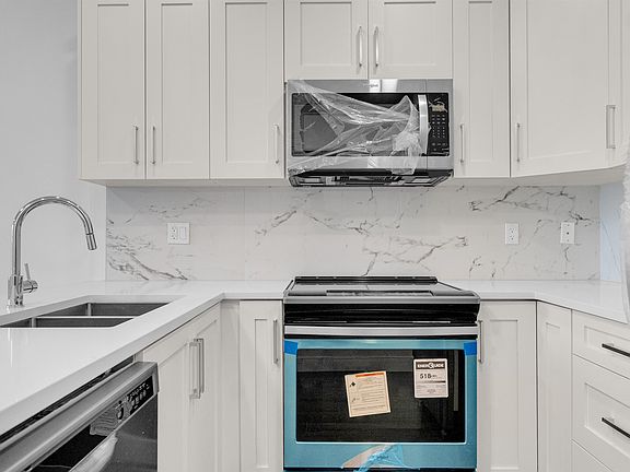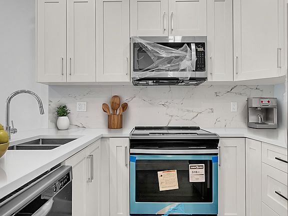 High ceilingsExpansive windowsSpacious open-concept layoutModern kitchenWhite cabinetryNatural quartz countertopsMarble-inspired backsplash