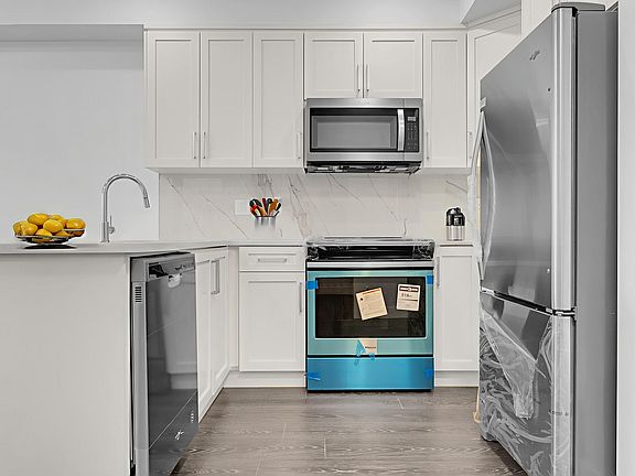 High ceilingsExpansive windowsSpacious open-concept layoutModern kitchenWhite cabinetryNatural quartz countertopsMarble-inspired backsplash