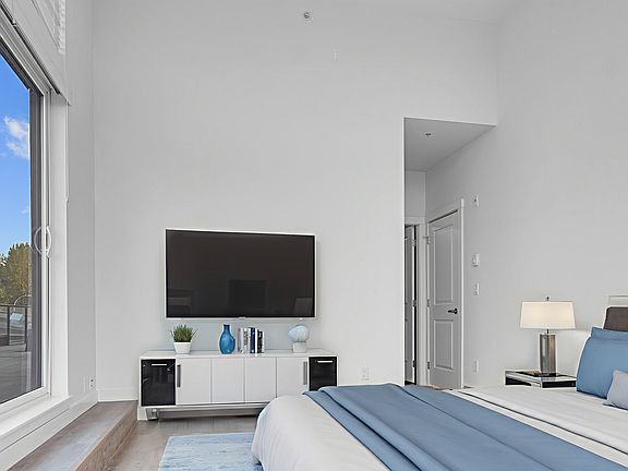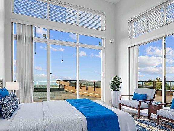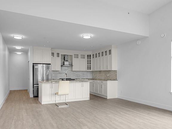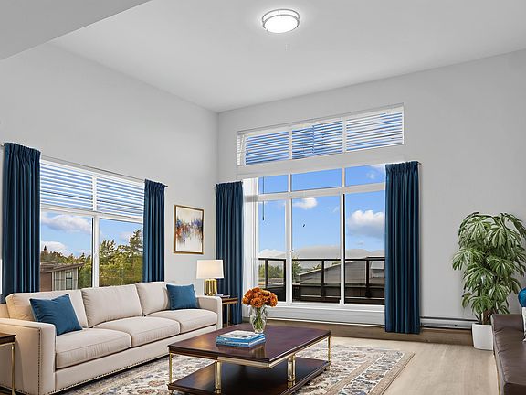 High ceilingsExpansive windowsSpacious open-concept layoutModern kitchenWhite cabinetryGranite countertopsMarble-inspired backsplash