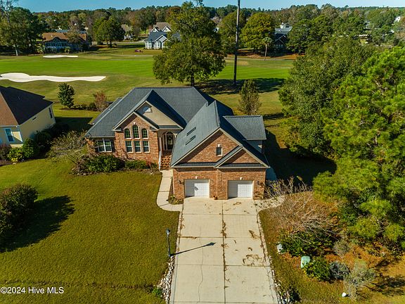This exquisite custom home is situated on the Azalea 3 Fairway in a gated golf course community. Plenty of curb appeal with this beautifully designed brick home with a stamped concrete front porch, and thoughtfully landscaped grounds. The elegant foyer welcomes you into Brazilian cherry hardwood floors. The great room offers a 12' coffered ceiling, gas fireplace, and oversized sliding doors to the Carolina Room. The formal dining includes cathedral windows, wainscoting, and a grand chandelier. The gourmet eat-in kitchen boasts granite countertops, stainless steel appliances, a gas cooktop, double oven, cherry cabinets with soft-close features, tile backsplash, under-cabinet lighting, and a breakfast bar illuminated by pendant lights. The owners' suite has a trey ceiling, his-and-hers closets, a luxurious en-suite bath with jetted tub, walk-in tiled shower, a double sink vanity, and picture window for plenty of natural light. The Carolina room is heated and cooled and overlooks the golf course. It exits to the stamped concrete back deck equipped with a propane grill connection and space heater, offering the perfect setting for al fresco dining or relaxing after a round of golf. The upstairs flex room is an entertainer's paradise featuring a wet bar, or could be a guest suite, office or den with an en-suite half bath, and a walk-in closet. The home also includes an oversized 2-Car garage with a golf cart Bay, epoxy flooring, and high-amp outlet for golf cart charging. Other features include a 3-zone heating and cooling system, 6-Zone Irrigation System, and a tankless water heater. Brunswick Plantation has an active social committee and homeowners enjoy amenities such as an indoor pool, hot tub, fitness center, several outdoor pools, along with tennis and pickleball courts. Close to the restaurants and shopping in Calabash, you are still only minutes to Sunset Beach and close to the attractions of Myrtle Beach. Some photos have been virtually enhanced and staged.