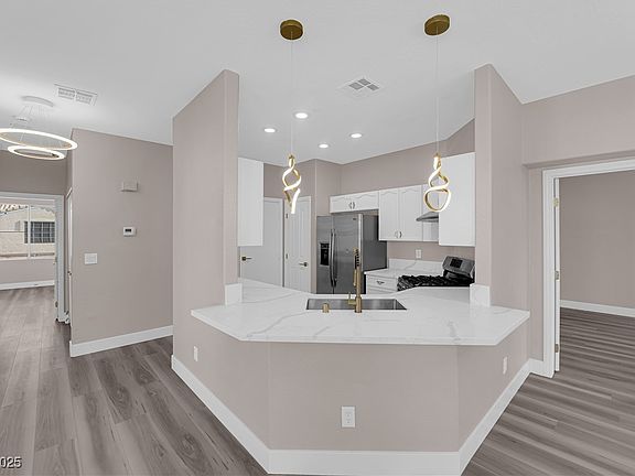 Welcome to this beautifully remodeled 2-bedroom, single-story home with a 2-car garage, located in the heart of Silverado Ranch with low HOA fees! This home features brand-new vinyl flooring throughout, fresh interior and exterior paint, and a stylish accent wall around the fireplace in the living room. The kitchen includes new countertops and stainless steel appliances, offering a clean, modern feel. Both bedrooms come with dual closets—perfect for extra storage or organizing your space. Sitting on a corner lot with street access, it has great curb appeal and a low-maintenance backyard. Come see it today!