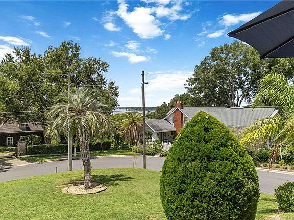 PICTURESQUE 3 BED / 3 BATH HOME ON A QUIET ½-ACRE CORNER LOT WITH VIEWS OF LAKE DORA! A newly brick-paved driveway leads to a welcoming front porch and brand-new front door. Step inside to a two-story layout that opens to a charming downstairs foyer, featuring a beautifully renovated staircase. Upstairs, the open-concept living, kitchen, and dining space is accented by rustic wood beams and a large vaulted ceiling. A striking floor-to-ceiling, wood-burning fireplace creates a cozy, inviting atmosphere. Two sets of French doors open to a 60-foot balcony—perfect for morning coffee or evening cocktails with stunning views of Lake Dora. The primary bedroom includes a newly renovated en-suite bathroom with Italian porcelain tile, modern fixtures, and updated lighting. An additional spacious bedroom and a stylish hallway bath complete the second floor. Downstairs features new vinyl plank flooring, a guest bedroom with a renovated full bathroom, laundry room, access to a 2-car garage, and a covered back porch with two outdoor ceiling fans—ideal for barbecuing and entertaining. With its own entrance, the lower level offers a perfect private retreat for guests or a potential in-law suite. Additional highlights include updated Samsung kitchen and laundry appliances, a wall safe, hurricane room, security system, smoke detectors, and an 85” Samsung wall-mounted flat-screen TV. Power outage ready with an exterior plug wired for a 1,200-watt generator—generator included! The lush yard is filled with year-round flowering plants and trees, plus the bonus of several fruit trees. This one-of-a-kind property offers natural beauty, privacy, and a true feeling of home—just a short, casual stroll to award-winning Downtown Mt. Dora! Furnishings fully negotiable with sale of home.