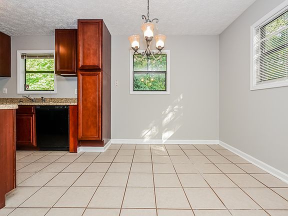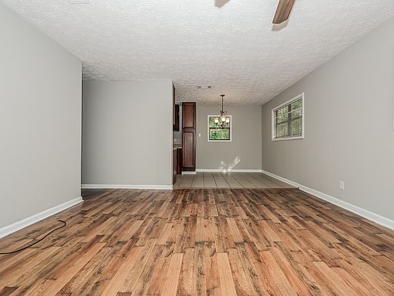Inside, the layout opens into a bright living area with large front windows and inviting views of the wooded surroundings. Brand-new dark brown LVP flooring extend throughout, bringing a cohesive and refreshed look to every room. The living space flows into a dining area positioned near twin windows, setting the stage for easy everyday routines. Adjacent sits the kitchen, equipped with rich-toned cabinetry, ample counter space, tile flooring, and direct views out to the serene backyard.