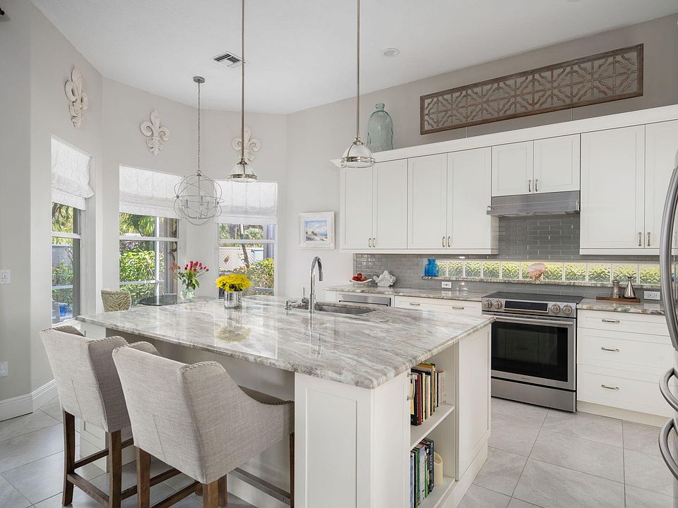 Wow factor! This 3 bedroom/2.5 bathroom home is full of natural light and has an open floor plan with high ceilings. It has porcelain tile throughout. The island kitchen contains custom built in cabinets and quartz countertops. Updated bathrooms and other renovations. A private backyard with lush landscaping. Accordion shutters. Lawn care is included along with deeded beach access and recreational facilities.