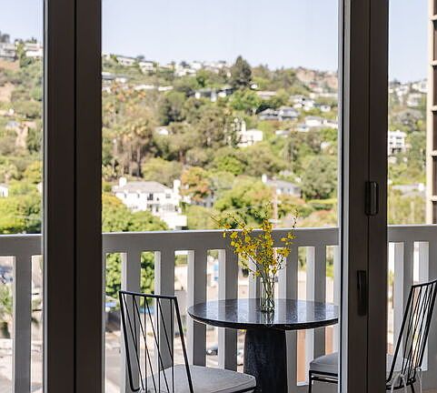 Welcome to Doheny West Towers, a luxury full-service building on the edge of Beverly Hills and West Hollywood. Residence 1003 is a 10th-floor corner unit offering panoramic views of the Hollywood Hills the moment you arrive. A wall of folding glass doors opens the living room to a private balcony, creating seamless indoor outdoor living. The designer kitchen features an open layout with a breakfast bar and Fisher & Paykel appliances. The primary suite includes a walk-in closet, automated blackout shades, and a marble bathroom; vistas extend across Beverly Hills and, on clear days, to the ocean. A removed wall opens the former second bedroom into a versatile flex space with beautiful custom built ins perfect for an office or media area. Thoughtfully placed just off the living space, a full bath provides both comfort and ease for visiting guests. Building amenities include 24-hour concierge/doorman, valet parking for guests, fitness center, pool, spa, sauna, and sun deck. One assigned parking space in the secure, gated subterranean garage. Available partially furnished for an additional fee - please inquire for details. Available now with a 13-month lease term.