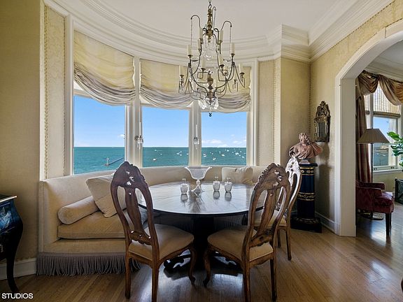 This Magnificent renovation of a Benjamin Marshall 's masterpiece 999 Lake Shore Drive. The "C" tier allows you to enter from a private lobby/elevator. Unit 5C was published in a very well known magazine for its elegance and design. This home's placement on a higher floor allows for the most amazing Lake Michigan views from the Living Room, Dining Room and Master Bedroom Suite, while offering city views and marvelous sunset views from the kitchen and second bedroom. Find the most intimate private terrace surrounded by lattice walls and planters for your morning coffee/tea or evening relaxation. The open floor plans is great for entertaining yet allows a feeling of intimacy; high ceilings, beautiful wood floors, fireplace, sun room off the primary bedroom suite with the most beautiful Lake Michigan views. The chef's kitchen complete with breakfast nook, including an ice maker and 2nd dishwasher in the Butlers Pantry. The formal dining room has been reconfigured into a sophisticated family room while the library/den complete with beautiful built-ins and book shelves. The laundry room is quite spacious, perfect for a caterer or packing room. Two storage rooms are included with the potential for plumbing if desired. 999 LSD also has the most amazing rooftop deck with entertainment seating, tables and barbeque to enjoy while taking in the beauty of Lake Michigan. A new workout room with all the equipment one would want. Parking next door, steps from the private C Foyer. Did we mention you'll enjoy sunrises and sunsets from this 2600 sq. ft home! Parking spaces for lease located conveniently next door. Short term parking available at the back of the building. Great for services, groceries and guests.