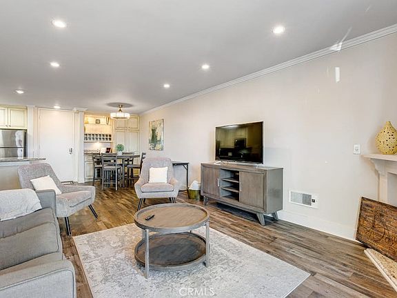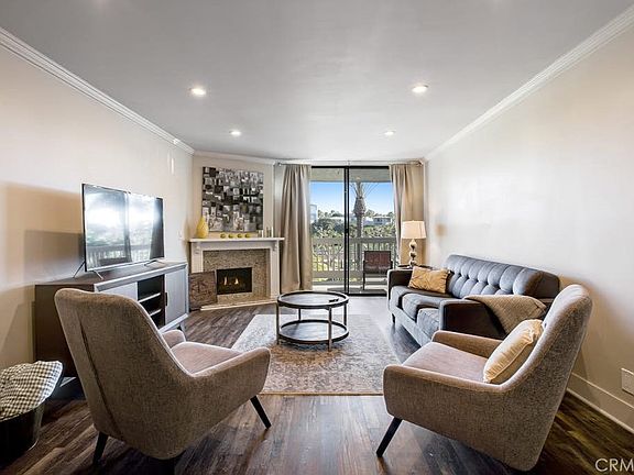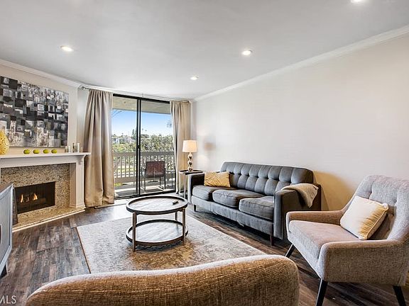 Modern condo in North Coast Village, Oceanside: this updated second-floor unit (Unit B108, 999 N Pacific St) offers 1 bedroom, 1 bath, 762 sq ft of interior living space, built in 1981, with gorgeous wood-look tile, crown moulding, recessed lighting, granite countertops and stylish cabinetry in both kitchen and bathroom; features include fireplace, enlarged double size balcony stretching from living room to bedroom, stainless steel appliances including dishwasher, microwave and garbage disposal, 1 assigned parking space in gated community, views (territorial & mountain), lot size approx. 11.51 acres, located <1 mile from Oceanside Harbor and beachfront, with resort-style shared amenities; community highlights include direct beach access, two heated pools, spa, sauna, BBQ area, tropical landscaping, koi ponds, billiards, new fitness center, mini-golf, lush gardens, and 24-hour gated security, all within walking distance to harbor, pier, restaurants, and activities—an excellent opportunity for primary residence, vacation retreat, or investment.