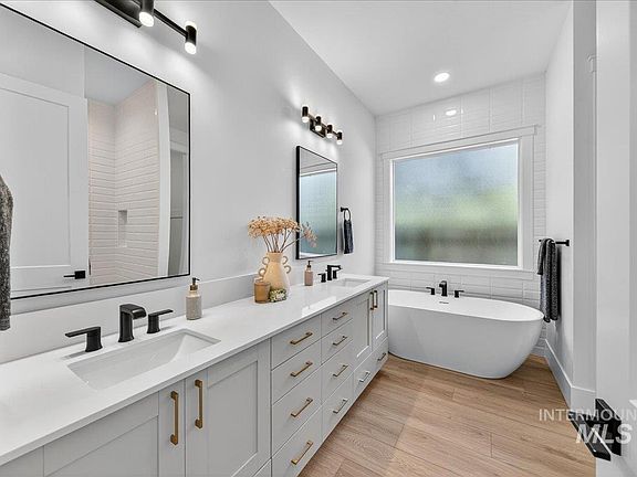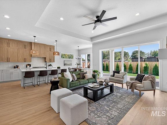 NW Boise new build with high-end functionality. This 2,100 sq ft single-level home by Story Builders delivers intentional design without compromise: 4 beds, 3 full baths, no HOA, RV/trailer parking, and less than ¼ mile from Eagle. Enjoy 10' ceilings throughout, 11' coffered in the entry, living & primary, a 9' quartz island, full-height kitchen cabinets, LVP in main areas, tiled showers, soaking tub, and an oversized fireplace. The primary closet is finished with a built-in safe. A thoughtfully designed laundry room adds convenience with a sink and upper cabinetry. 220V inside/outside for RV or EV. Covered back patio with gas stub ready for BBQ season. Second home with same layout + different elevation available on adjacent separate lot (completion: mid-end of October.)