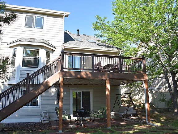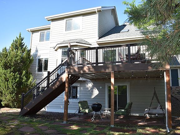 Welcome home to this 5 bed, 3.5 bath spacious corner lot home with views of Lone Tree Bluffs in the popular Carriage Club neighborhood in Lone Tree. An open floorplan with duplex cathedral ceilings in the family room gives this house a flow of warmth and space. A gorgeous finished walk out basement with wet bar is pre-wired for sound to build a home theatre. A new large Trex deck with water proofed underdeck drainage system make the large private backyard perfect for entertaining and relaxing during the summer months. New triple pane LEI windows are installed in the whole house to keep you warm in the winters and cool during summers with negligible heating and cooling cost. The 3-car oversized garage offers a lot of storage. A main floor office provides for the convenience of working from home. Dramatic staircase at entry. Laundry room conveniently located upstairs. Huge kitchen w/hardwood floors, island workstation, breakfast bar, bread bin, & glass corner cabinet, pantry, desk area, & separate eating space w/bay window. 2 story family room w/fireplace. Master bedroom separated from other upstairs bedrooms provides privacy & includes vaulted ceiling, large walk-in closet, separate dressing area w/vanity, & 5-piece bath. Spacious 2nd & 3rd Bedrooms w/ walk-in closets. Amazing walk-out basement w/built-in TV nook surround sound wiring, wet bar, lots of can lights to create a bright environment, & separate area for an eating or game table. Guest suite in basement includes bedroom w/ private sitting area. A brand-new roof, new windows and newer hot water heater make this house move-in-ready! Professionally landscaped gorgeous backyard w/evergreen trees, flagstone patio off the walk-out basement. Expanded deck on main level w/great views of open space, trail, & of the bluffs of Lone Tree. Top Location, close to I-25, Park Meadows Mall, Lone Tree Bluffs, Shopping and much more.