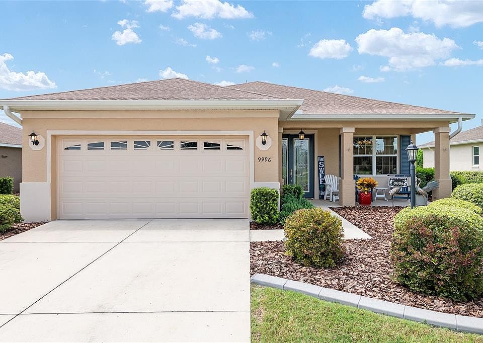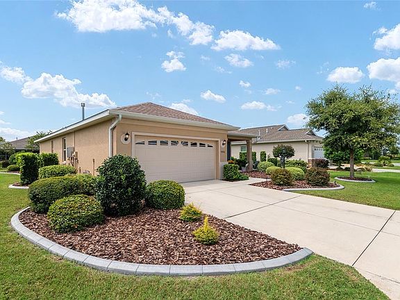 Welcome to this beautifully maintained Kent model in the Avalon 4 community. This 2-bedroom, 2-bath home with a 2-car garage features stylish upgrades, modern finishes, and a peaceful golf course view with no front neighbors. The open layout showcases luxury vinyl plank flooring, crown molding, ceiling fans, and plenty of natural light. The kitchen offers dual-toned, staggered cabinetry with crown molding, a tile backsplash, granite countertops with pendant lighting, and Whirlpool stainless steel appliances including a gas range and microwave. A pantry and eat-in dining area with window blinds add to the functionality. The living room opens with sliders, also fitted with blinds, to a screened lanai with a ceiling fan and pull-down shades, all overlooking landscaped privacy hedges. The primary suite includes a ceiling fan, 2 windows with blinds, a walk-in closet, and an en suite bath featuring a zero-entry tiled shower with bench, dual quartz sinks, tile flooring, and a linen closet. The guest bedroom offers a Murphy bed with built-in desk, a closet, and window blinds, while the 2nd bath provides a tiled tub and shower combination, quartz sink, wood cabinetry, and tile flooring. A hallway closet provides extra storage, and the laundry closet is equipped with a Maytag washer and dryer. The 2-car garage features an epoxy-coated floor, and the home is complete with gutters, curbed landscaping, and a private setting with golf course views in the front and privacy hedges in the rear. Located in Ocala's premier, gated, active 55+ community, loaded with amenities, including golf cart access to 2 shopping centers.