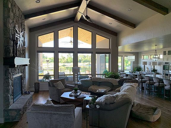 Shadow Mountain custom built home. Lake frontage with Boise River behind the lake. Hardwood floors throughout. Quartzite counter tops. Butler pantry with sink, second dishwasher, wine, and beverage fridge. Bosh appliances. Rock fireplace. Stamped concrete patio full width of house to enjoy the view of lake. Full outdoor kitchen with granite counter top. Retractable awning. Marble master bath with soaker tub and huge shower. Heated floors in master bath. Security system. Outdoor cameras. Whole house audio visual system. Hot water on demand for whole house. Water softener for whole house. 140 sq foot detached garden shed. 1250 square foot garage wired for shop.