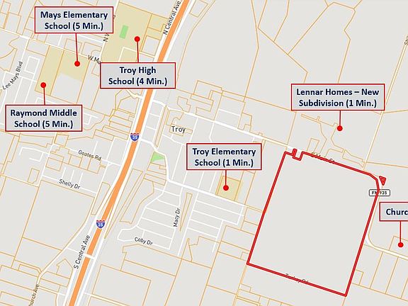 Introducing a rare opportunity to own 231.11 acres of prime development or investment land in the rapidly growing area. This versatile tract with over 10,812 feet of frontage on 3 sides of the lot and road access along 80% of its perimeter, offering unparalleled accessibility. Approximately 42 acres are already in Troy city limits, and the rest may be annexed. Located just 1 minute from Troy Elementary and 4 minutes from Troy High School, and directly across from a brand new 285-lot subdivision built by national developers, this parcel is poised for growth. Situated just 0.8 miles from I-35 and only 9 miles to Temple, this location combines rural charm with urban convenience. The land features rolling topography with over 100 feet of elevation change, long-range views, and a mix of native trees perfect for a scenic community layout. With Ag Exemption in place and minimal floodplain, the site offers both short- and long-term value. All essential utilities—water, sewer, and electricity—are accessible, making it attractive for single-family homes, townhomes, multifamily, or commercial developments. In addition to its location benefits, the land’s layout and natural features make it ideal for a thoughtfully designed community with open spaces, walking trails, and potential park areas. With rising demand for housing in the I-35 corridor, this property stands out as a rare, large-scale canvas for both residential and mixed-use development. Multiple subdivided parcels are also available, with ability to customize the total acreage from 20+ to 231+ acres depending on buyer needs. Whether you're an experienced developer or investor seeking long-term appreciation, don’t miss this chance to create something remarkable in one of Central Texas’s most promising corridors! *The seller is highly motivated and open to all offers. Start with a Letter of Intent (LOI). Detailed Offering Memorandum (OM) and Drone Video available upon request.* Call/Text Agent Madhu