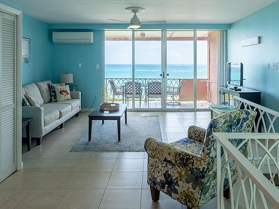 Indulge in island luxury at this exceptional 2 bedroom, 2 bathroom condo at Coakley Bay Condominium on the vibrant East End of St. Croix. This end unit with Western exposure promises a uniquely private experience with breathtaking panoramic views of the Caribbean Sea.The living room and adjacent gallery showcases the heart of this condo; a space where comfort meets elegance. Large sliding glass doors invite the vibrant island sunlight, highlighting the tasteful decor and creating a welcoming atmosphere. Split AC's throughout ensure your relaxation in any season. An updated kitchen, boasts modern sophistication with granite counters and a glass tile backsplash to match the cerulean waters of the Sea, inviting you to explore culinary delights while soaking in the stunning surroundings. The primary bedroom is a serene retreat adorned with its own private gallery and updated bathroom.