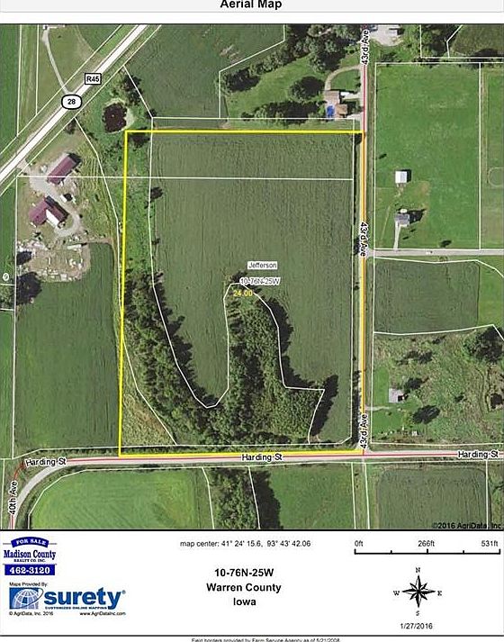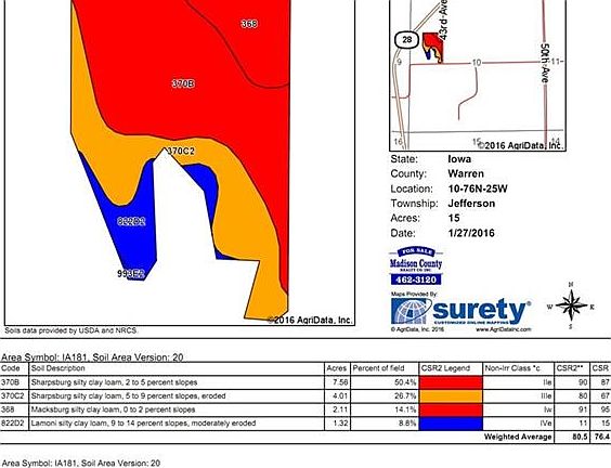 Nice 24 acres m/l acreage located 15 minutes south of Des Moines just off Hwy 28 in Prole, IA. adjacent to Palisades Equestrian Estates. The property has around 15 acres tillable with the balance being timber. The crop ground has an average CSR2 of 79.9. Subject to tenants rights. Would make an excellent horse acreage. Rural water and electric at the road. No covenants.