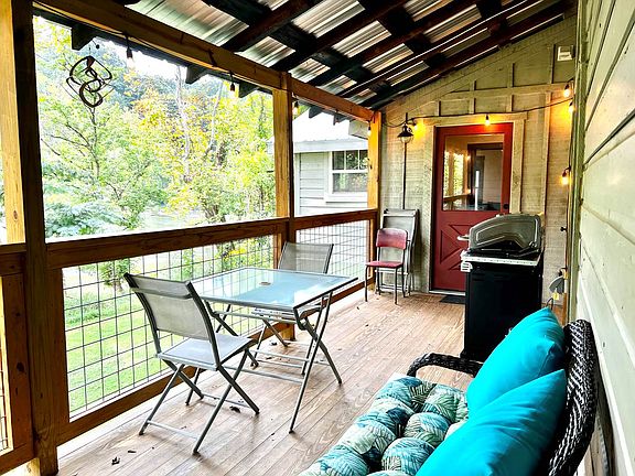 Covered deck, flat yard and with River Frontage. Two full kitchens and private entrances interconnected floors if desired. 14 Minutes from Asheville