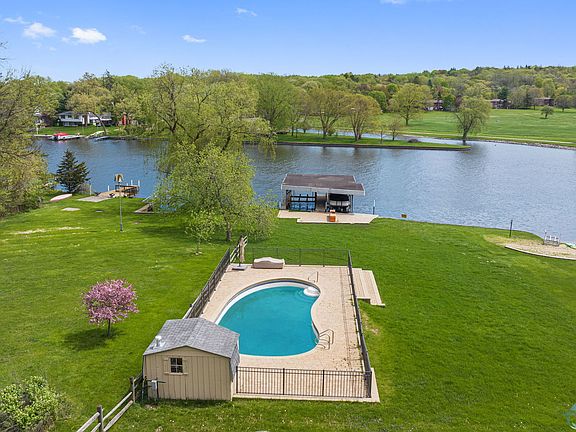 Home has been renovated new siding and paint new windows and doors, new decks updated kitchen and bathrooms in last 3 years. Kitchen has butler pantry and massive island with a breakfast bar and two spots for wine/beverage refrigerators. Walk out basement with bath rough in waiting for your finishing touches. In ground pool with brick pave patio deck and fence. Right on the Fox River with an oversized 2 boat slip that is covered with power winches. The views from the kitchen and great room are stunning. Master suite on 2nd floor with private bath walk in closet. Sit on your private deck off the master bedroom and have your morning coffee while looking at the river. Great opportunity for a summer home or for a year-round staycation.