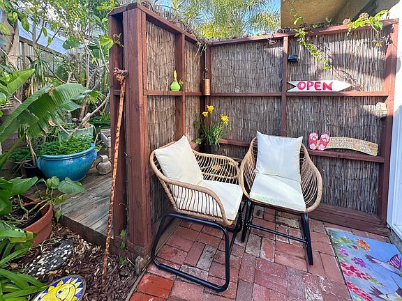 Lush, private garden with outdoor seating